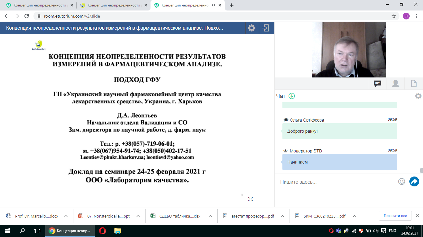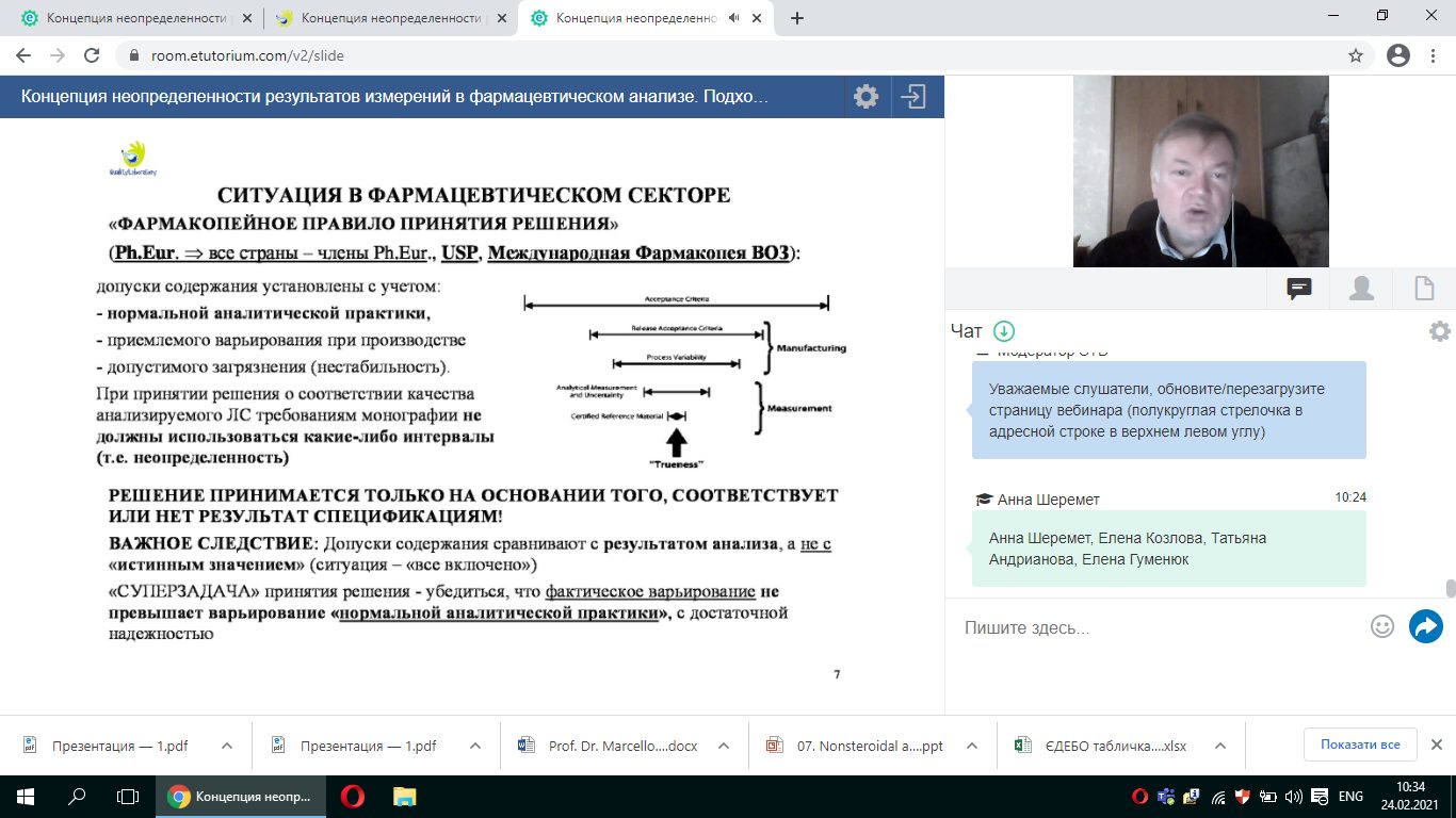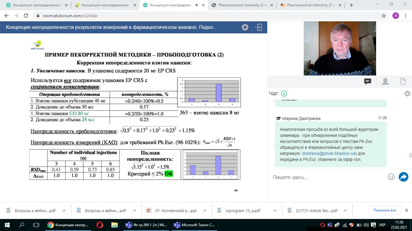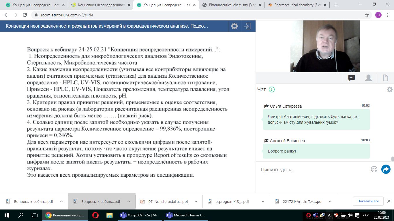 24-25.02.2021 року завідувач кафедри фармацевтичної хімії ТНМУ Лілія Логойда взяла участь у семінарі «Концепція невизначеності результатів вимірювань у фармацевтичному аналізі. Підхід ДФУ». Лектором заходу був Дмитро Анатолійович Леонтьев – д. фарм. н., начальник відділу валідації та стандартних зразків, заступник директора по науковій роботі Державного підприємства «Український науковий фармакопейний центр якості лікарських засобів» МОЗ України, профессор кафедри фармацевтичної хімії Національного фармацевтичного університету. У семінарі взяли участь 88 учасників (співробітники лабораторій контролю якості лікарських засобів, фахівці із забезпечення якості в лабораторіях хімічного аналізу, фахівці в галузі фармацевтичної розробки). Були також і фахівці з-за кордону.