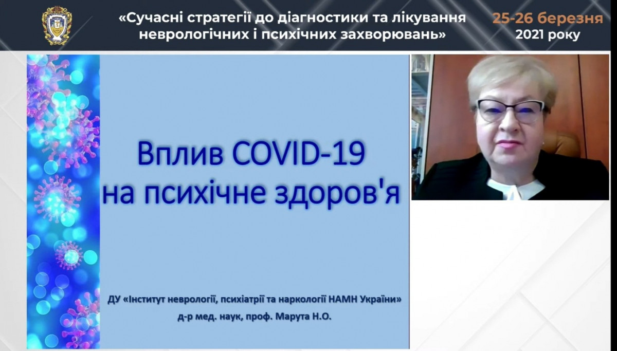 Розпочала пленарні виступи з доповіддю «Вплив COVID-19 на психічне здоров’я» заступник директора з наукової роботи ДУ «Інститут неврології, психіатрії та наркології НАМН України», керівник відділу неврозів і пограничних станів Інституту, віце-президент Науково-практичного товариства неврологів, психіатрів та наркологів України, Заслужений діяч науки України, академік АНВО, доктор медичних наук, професор Наталя Марута.