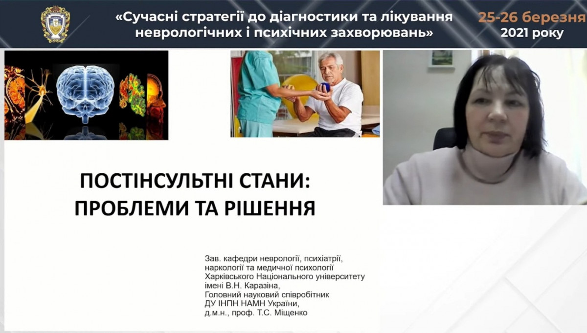 Завідувач кафедри неврології, психіатрії, наркології та медичної психології Харківського національного університету імені В.Каразіна, головний науковий співробітник ДУ «Інститут неврології, психіатрії та наркології НАМН України», академік Академії наук вищої освіти України, заслужений діяч науки та техніки України, доктор медичних наук, професор Тамара Міщенко представила доповідь «Постінсультні стани: проблеми та рішення».