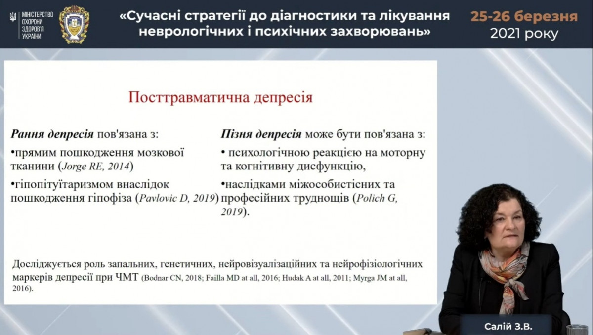 Доктор медичних наук, доцент кафедри неврології ТНМУ імені І.Горбачевського Зоя Салій під час виступу на тему: «Депресія при неврологічній патології. Виклик реальності.» привернула увагу до актуальної міждисциплінарної проблеми – депресії. Наведено результати чисельних досліджень останнього десятиліття щодо епідеміології, патогенезу та особливостей клініки при низці неврологічних захворювань (інсульті, ЧМТ, хворобі Паркінсона тощо). Депресія в неврологічній практиці часто поєднується з тривогою, хронічним болем, що негативно впливає на відновлення втрачених функцій, фізичну та когнітивну реабілітацію після інсульту та ЧМТ; обтяжує клінічну картину при хворобі Паркінсона, підвищуючи ризик суїциду вдвічі. Наголошено, що важливим є вчасне розпізнавання проблеми, адекватне реагування з застосуванням комплексних методик та використання антидепресантів універсальної дії. В період пандемії COVID-19, соціальна депривація та обмеження реабілітаційних заходів значно підвищують ризик розвитку депресії у неврологічних пацієнтів.