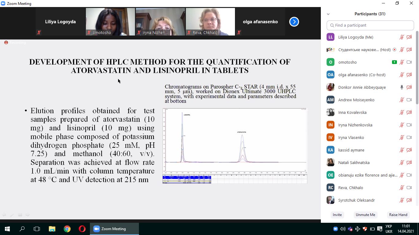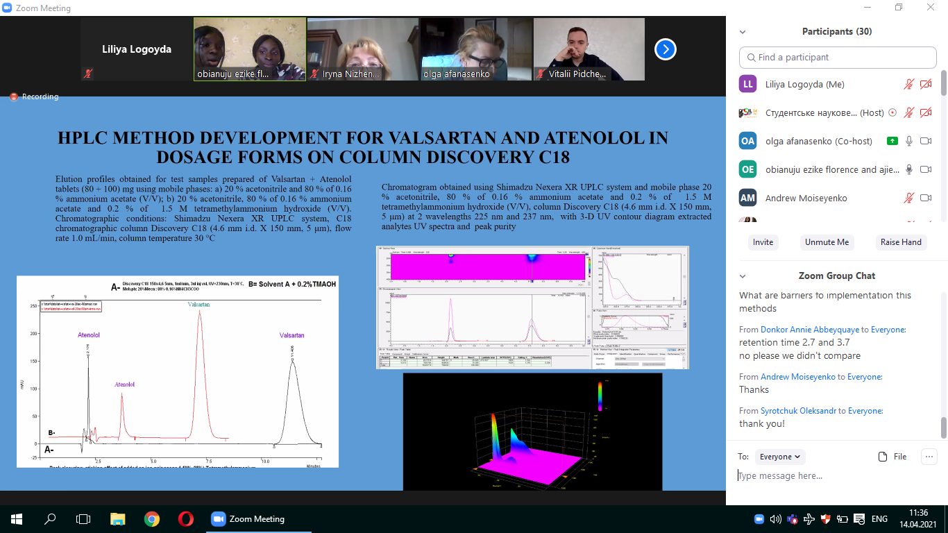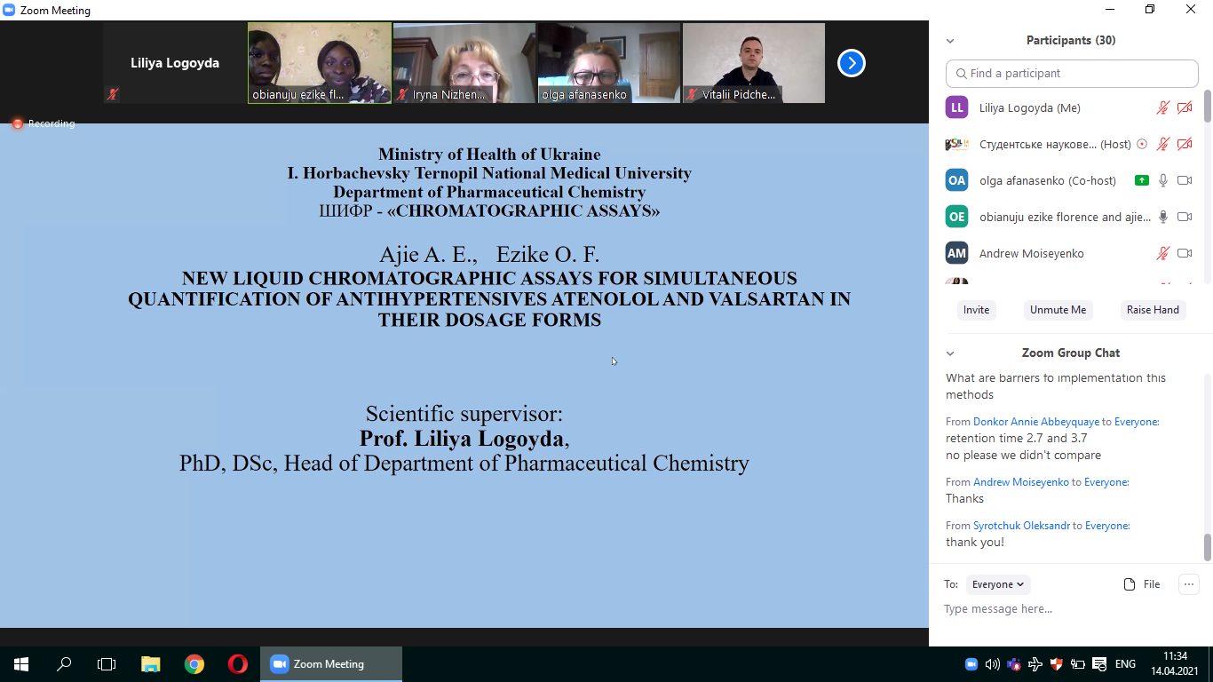 На цьогорічному конкурсі наш університет представляли чотири студенти – Obianuju Florence Ezike, Adaeze Elizabeth Ajie, Donkor Annie Abbeyquaye, Oluwatobiloba Joy Omotosho, які навчаються на п’ятому курсі факультету іноземних студентів (спеціальність «Фармація»). Obianuju Florence Ezike та Adaeze Elizabeth Ajie презентували спільну дослідницьку роботу «New Liquid Chromatographic Assays for Simultaneous Quantification of Antihypertensives Atenolol and Valsartan in their Dosage Forms», Donkor Annie Abbeyquaye та Oluwatobiloba Joy Omotosho – спільну дослідницьку роботу «HPLC Method Development for the Determination of Atorvastatin and its Impurities and Development of HPLC Methods for the Quantification of Atorvastatin and Lisinopril in Tablets». Робота виконана на кафедрі фармацевтичної хімії ТНМУ. Науковим керівником студентів є завідувач кафедри фармацевтичної хімії, професор Лілія Логойда.