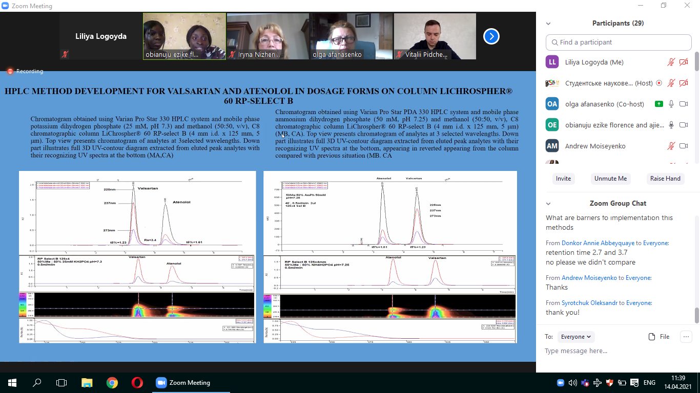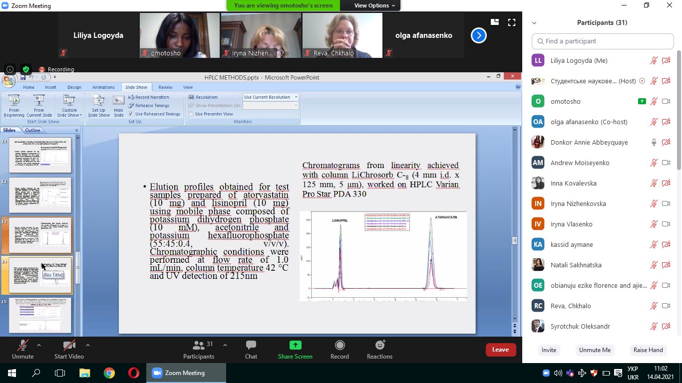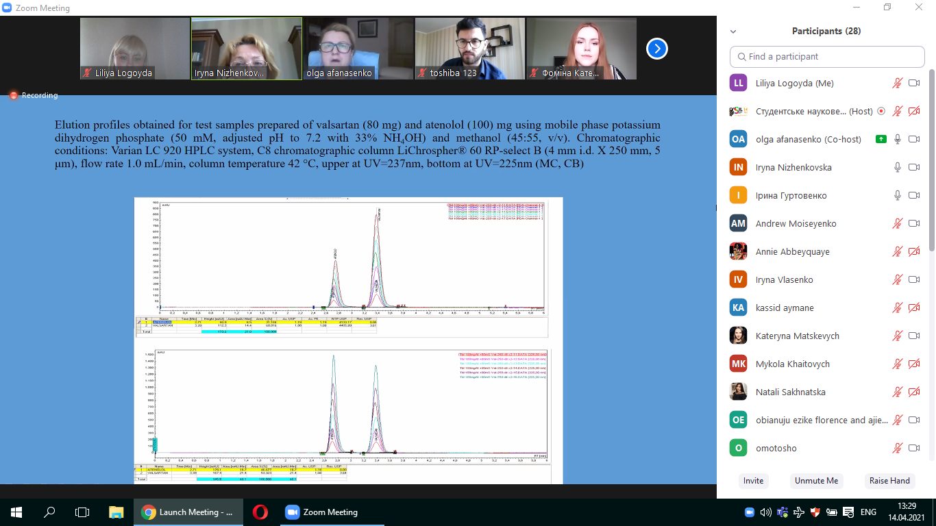 На цьогорічному конкурсі наш університет представляли чотири студенти – Obianuju Florence Ezike, Adaeze Elizabeth Ajie, Donkor Annie Abbeyquaye, Oluwatobiloba Joy Omotosho, які навчаються на п’ятому курсі факультету іноземних студентів (спеціальність «Фармація»). Obianuju Florence Ezike та Adaeze Elizabeth Ajie презентували спільну дослідницьку роботу «New Liquid Chromatographic Assays for Simultaneous Quantification of Antihypertensives Atenolol and Valsartan in their Dosage Forms», Donkor Annie Abbeyquaye та Oluwatobiloba Joy Omotosho – спільну дослідницьку роботу «HPLC Method Development for the Determination of Atorvastatin and its Impurities and Development of HPLC Methods for the Quantification of Atorvastatin and Lisinopril in Tablets». Робота виконана на кафедрі фармацевтичної хімії ТНМУ. Науковим керівником студентів є завідувач кафедри фармацевтичної хімії, професор Лілія Логойда.