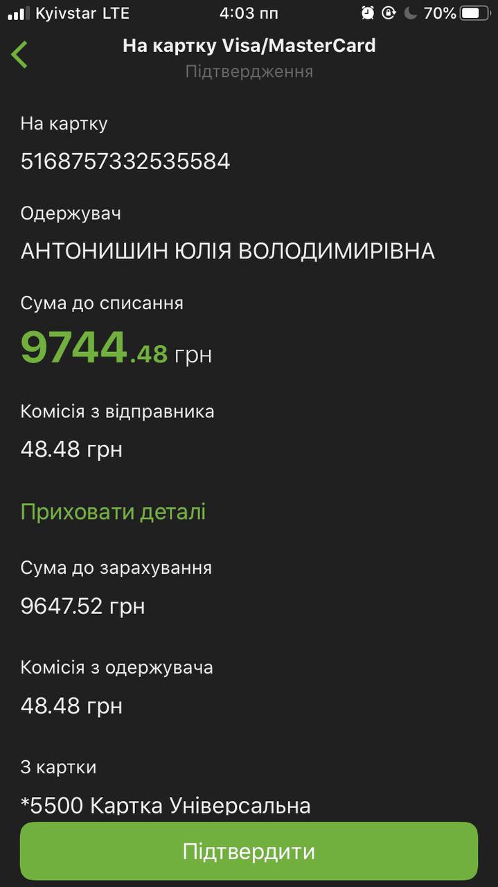 ПРИВАТБАНК (ДОЛАРОВА) (USD)5168745102886956 IBAN:UA293052990000026201895250856 ANTONYSHYN YULIIA (Мама)