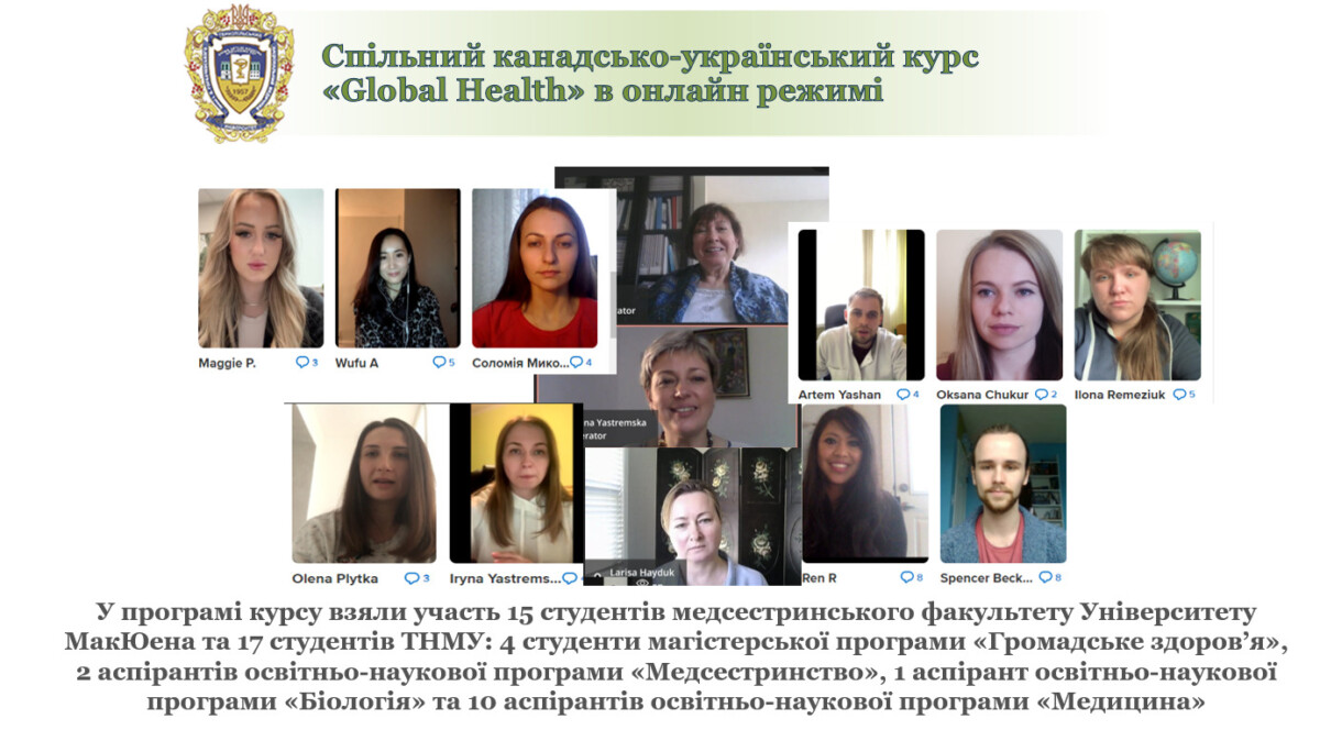 З 04 травня до 04 червня 2021 р. студенти та викладачі ННІ медсестринства Тернопільського національного медичного університету вивчали спільний канадсько-український курс «Global Health», ініційований в рамках співпраці ТНМУ та Університету МакЮена (Едмонтон, Канада). Цьогорічний четвертий канадсько-український навчальний курс проходив у новому форматі і був присвячений проблемам харчування. У програмі курсу взяли участь 15 студентів медсестринського факультету Університету МакЮена та 17 студентів ТНМУ: 4 студенти магістерської програми «Громадське здоров’я», 2 аспірантів освітньо-наукової програми «Медсестринство», 1 аспірант освітньо-наукової програми «Біологія» та 10 аспірантів освітньо-наукової програми «Медицина». Лідерами та розробниками курсу з канадського сторони стали: Лариса Гайдук, директор Українських ініціатив, Українського центру ресурсів та розвитку при Університеті МакЮена та Елізабет Бурґес-Пінто, RN, PhD, доцент кафедри медсестринських наук. З боку ТНМУ свої зусилля доклали: Світлана Ястремська, д-р пед. наук, керівник навчально-наукового інституту медсестринства, Ганна Сатурська, д-р мед. наук, завідувач кафедри громадського здоров’я та управління охороною здоров’я, Світлана Даньчак к.мед. наук, заступник керівника ННІ медсестринства, Людмила Мазур, к.мед. наук, доцент кафедри клінічної імунології, алергології та загального догляду за хворими, Борис Локай, к.мед. наук, доцент кафедри клінічної імунології, алергології та загального догляду за хворими, Ольга Лепявко-Креховська, к.мед. наук, асистент кафедри клінічної імунології, алергології та загального догляду за хворими, Наталія Петренко, к.мед. наук, доцент кафедри акушерства та гінекології №2, Наталія Галіяш, к.мед. наук, доцент кафедри педіатрії №2 і Людмила Наумова, к.мед. наук, доцент кафедри внутрішньої медицини № 1.