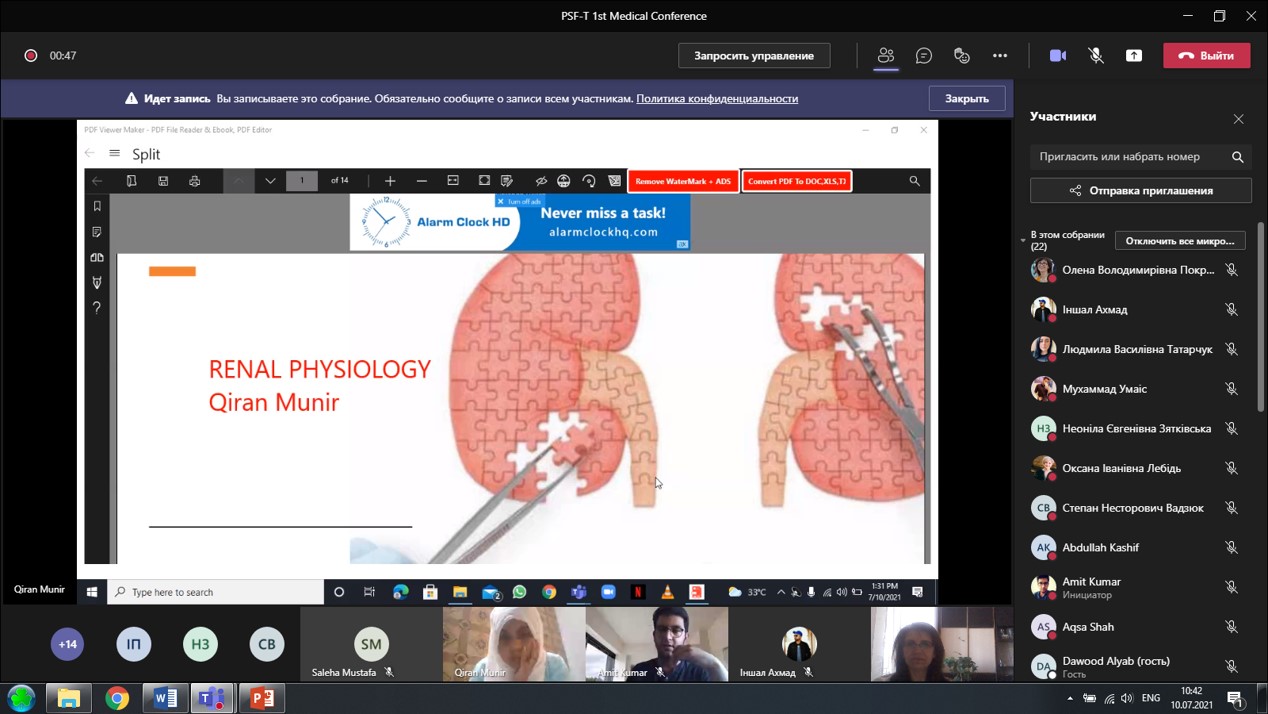 Мухаммад Талха (IM-330) доповів про фізіологічні механізми пам’яті та навчання, Салеха Мустафа (IM- 642) – про фізіологію дихальної системи, Кіран Му нір (IM- 375) розповіла про фізіологію сечової системи, детально охарактеризувала діяльність нирок, Іншал Ахмед (IM-429) – про фізіологію травної системи та Ріда Сахер (IM- 448) обрала тему фізіології провідності серця.