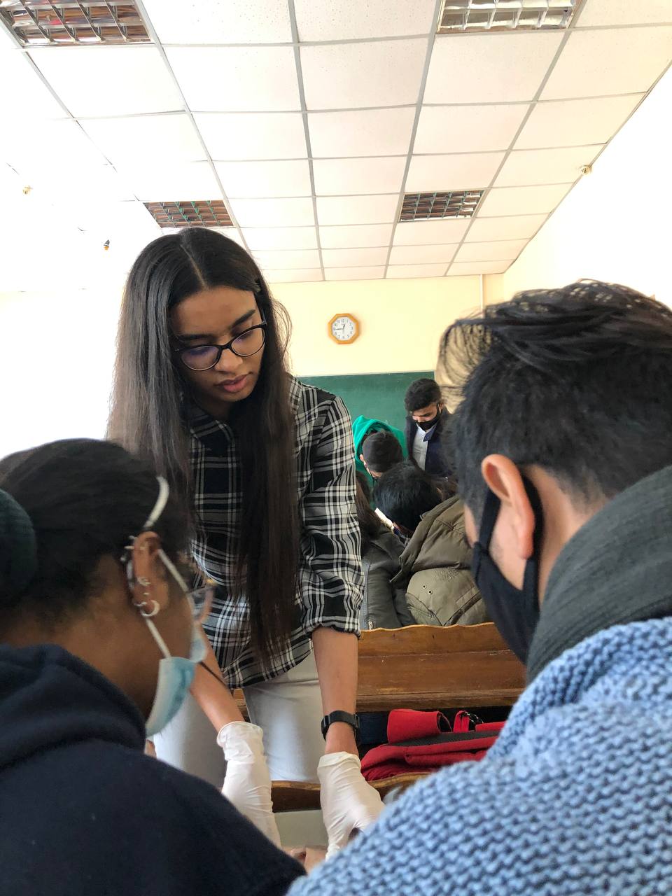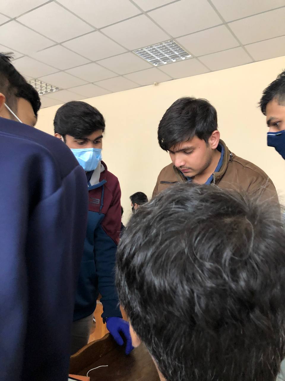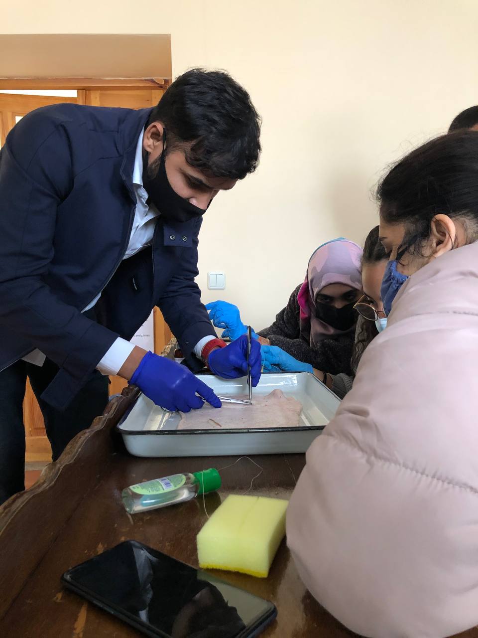 Спочатку студенти вивчали те, як правильно робити хірургічні вузли, як використовувати хірургічні інструменти. Після цього вони перейшли до практичної частини заняття і накладали шви на свинячу шкіру.