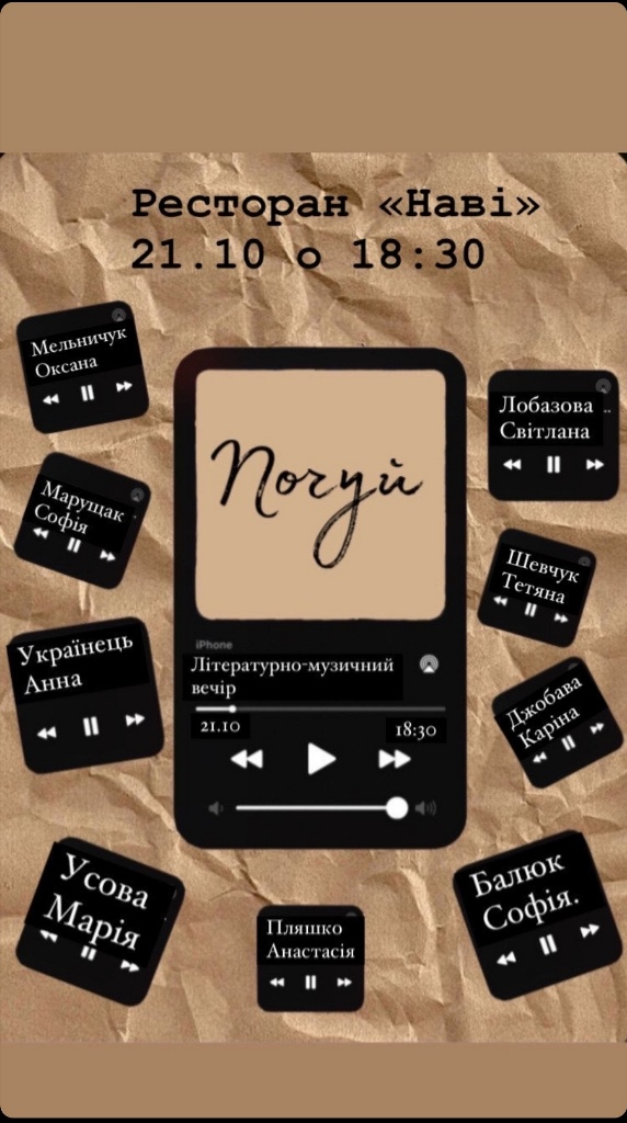 21 жовтня 2021 року у закладі «Наві» за багаторічною традицією Творчого колективу ТНМУ відбувся літературно-музичний вечір «Почуй». Організатори заходу – Марія Усова, Світлана Лобазова та Анна Українець мали на меті створити затишну, спокійну атмосферу, яка дає можливість гостям насолодитися авторською поезією та каверами відомих пісень.