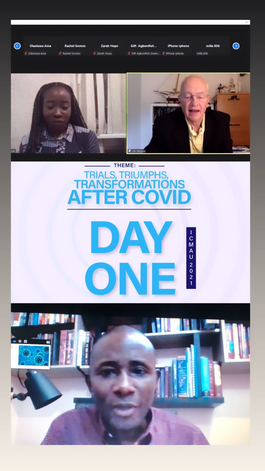 Лікар-педіатр Jim Peipon (США/Україна) доповів на тему «A Saline Process Taster». Лікар-хірург, регіональний секретар ICMDA Євразія, Індія/Англія Noel Aruparayil розповів про вплив COVID на клінічне, духовне та особисте життя.