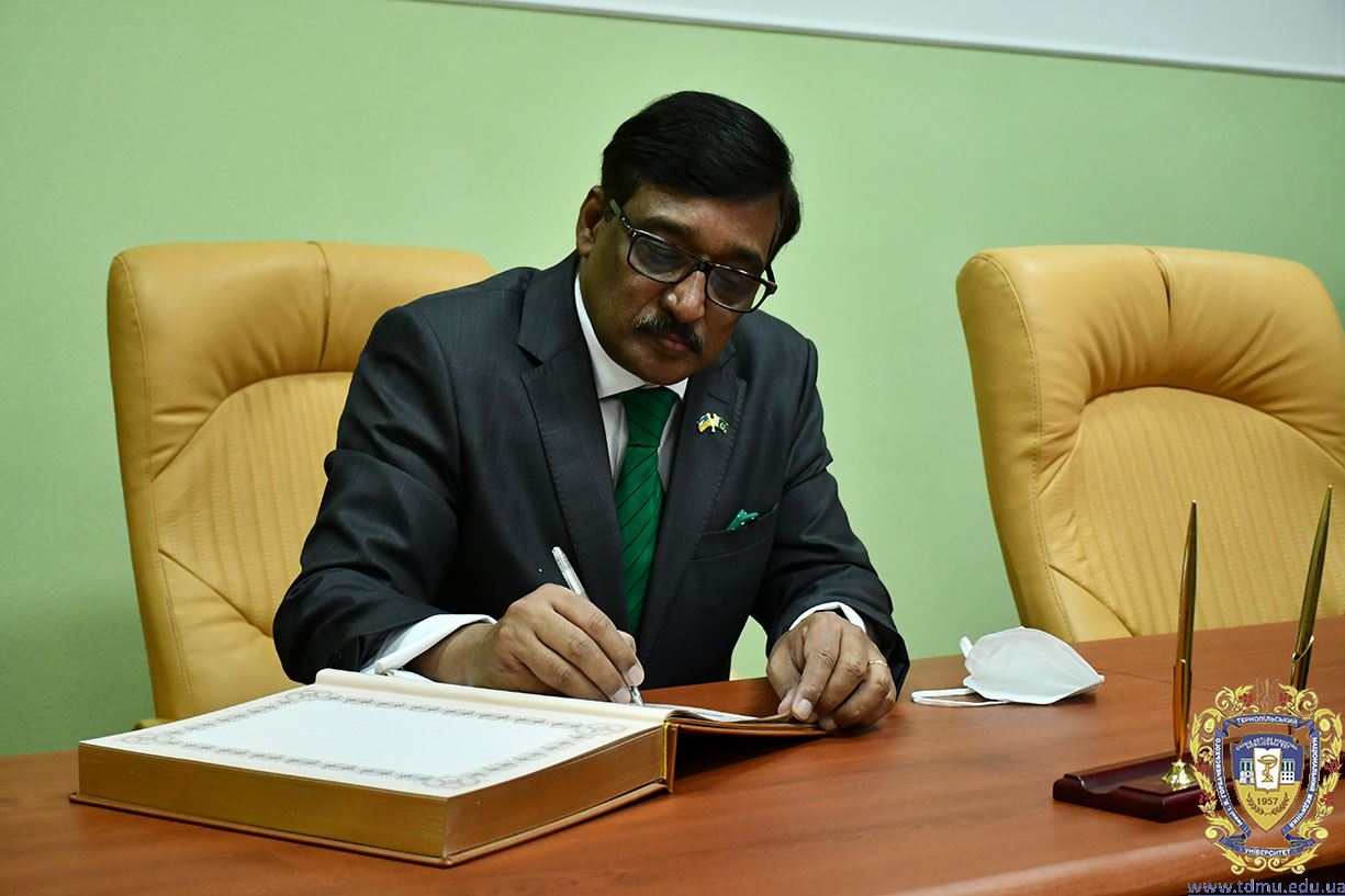 Під час свого перебування в ТНМУ високоповажний гість зустрівся з ректором, професором Михайлом Кордою, проректором з науково-педагогічної роботи, професором Аркадієм Шульгаєм, проректором з науково-педагогічної та лікувальної роботи, професором Степаном Запорожаном, заступником ректора з міжнародних зв’язків Наталією Лісничук, деканом факультету іноземних студентів, професором Петром Сельським та студентами з Пакистану, які навчаються в медичному виші Тернополя. Мова йшла про розширення напрямків співпраці в царині медичної освіти і науки.