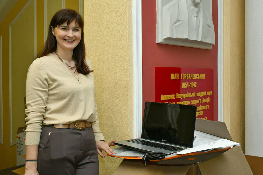 Цей пристрій прибув до волонтерського центру ТНМУ у гуманітарному вантажі зі США, який надіслала тернополянка Оксана Танасів (дівоче – Сидорко). Про потребу у ноутбуці розповіли волонтери, які допомагали працівникам центру під час великої кількості бажаючих здати кров.