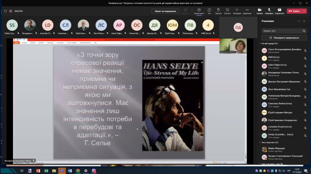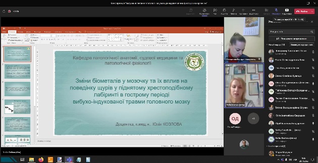 Продовжила засідання Денефіль Ольга Володимирівна. Вона розказала про дослідження зміни психічного стану серед студентів різної статті протягом теперішньої війни. Цікаві дані були зібрані разом з гуртківцями кафедри патологічної фізіології Софією Мусієнко і Юлією Зьомко та представлені в доповіді «Зміни психологічних характеристик студенів під час війни».