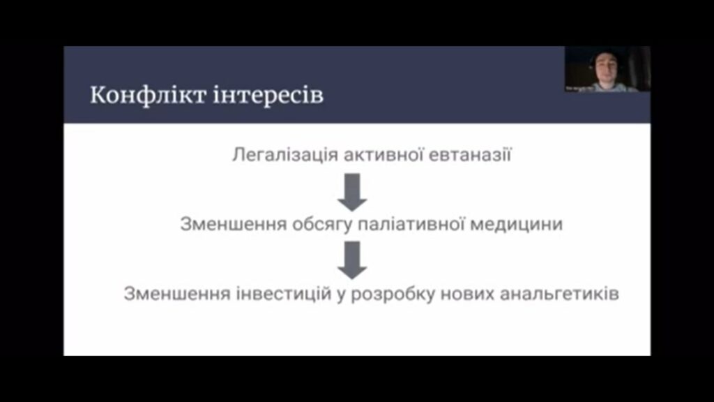 Зараз ми живемо у складний час, в нашій державі триває війна, яка забирає багато життів українських військових та мирних жителів, тому обрана тема набрала ще більшої суперечливості та гостроти бачення. Незважаючи на це, кожна команда подала влучні та правильні аргументи щодо питання евтаназії. Кожна думка мала своє місце та детально розглядалася командами. Учасники підійшли до цього питання відповідально та подали обґрунтовані аргументи як за, так і проти. Обидві команди почерпнули нову корисну інформацію та зробили для себе висновки. В дискусії подавалася інформація щодо держав, які підтримують евтаназію, та ситуацію стосовно цього питання в Україні, а також обговорювалися види евтаназії та, звичайно, наводилися аргументи за та проти. Дискусія пройшла успішно та досить інформативно.