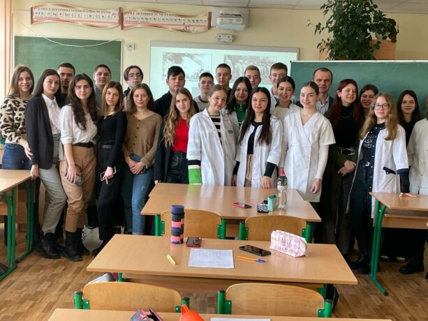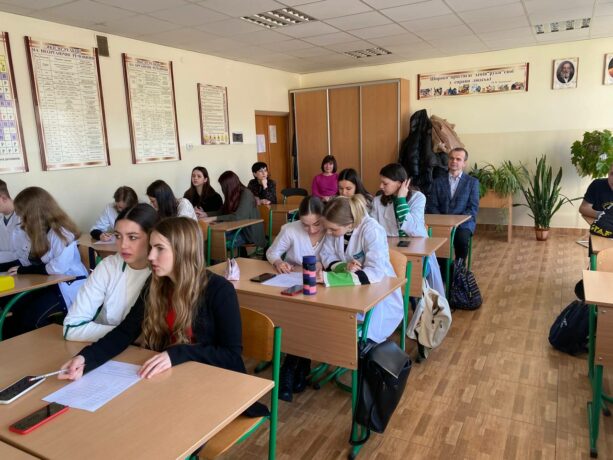 Студенти 129-ї групи також поділилися враженнями з учнями про навчання в університеті, зокрема закцентувавши увагу на важливості вивчення латинської медичної термінології, яка є необхідною і дуже корисною при вивченні інших дисциплін та у професійній діяльності лікаря.