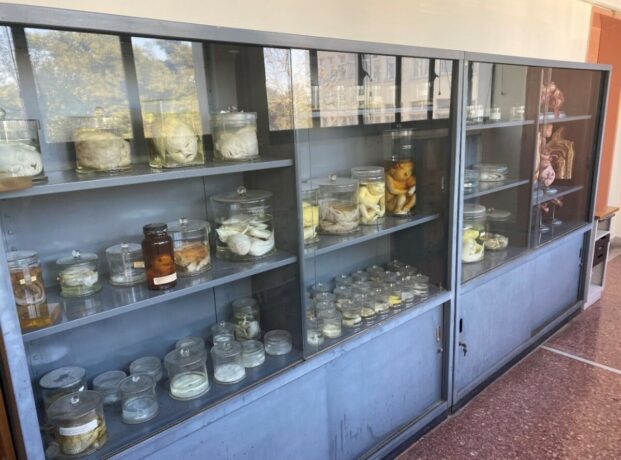 Доцент Пасхаліс Теотокіс проводить екскурсію навчальними приміщеннями кафедри гістології та ембріології.