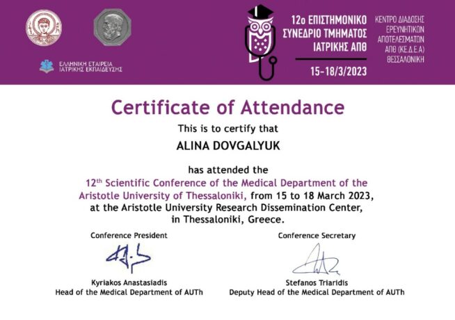 10-19 березня 2023 року відбувся візит доцента кафедри гістології та ембріології, завідувачки відділом клітинних культур сектору експериментальних досліджень МНДЛ ТНМУ Аліни Довгалюк до Школи медицини університету Арістотеля в місті Салоніки (Греція). Це відрядження було організоване з метою обміну досвідом з питань біотехнології стовбурових клітин та регенеративної медицини у рамках програми ERASMUS+ KA1 Staff Mobility – Mobility for Training.