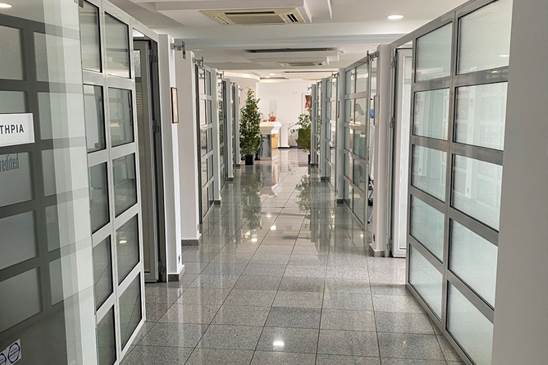 Коридорами наукових лабораторій центрального офісу Biohellenika в Салоніках , що сукупно займають площу понад 2800 м2.