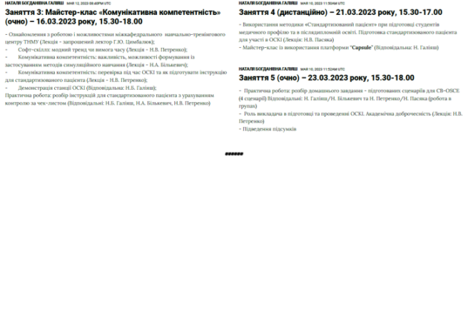 Курси мали на меті підвищити обізнаність викладачів щодо правил організації та проведення об’єктивного структурованого клінічного іспиту (ОСКІ), ознайомити з новими можливостями перевірки формування компетентностей у студентів з використанням комп’ютерних технологій, поліпшити навички створення клінічних сценаріїв для ОСКІ як в оф-лайн форматі, так і з віртуальною симуляцією кейсів. Програма курсів була розрахована на 1 кредит ЕКТС (30 годин). Для спілкування та поширення інформації куратори курсів запропонували освоїти формат сторінки Padlet, на якій учасники могли знайти розклад та всю необхідну для самостійного опрацювання інформацію.