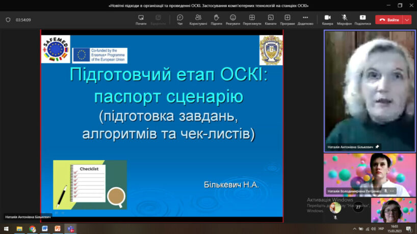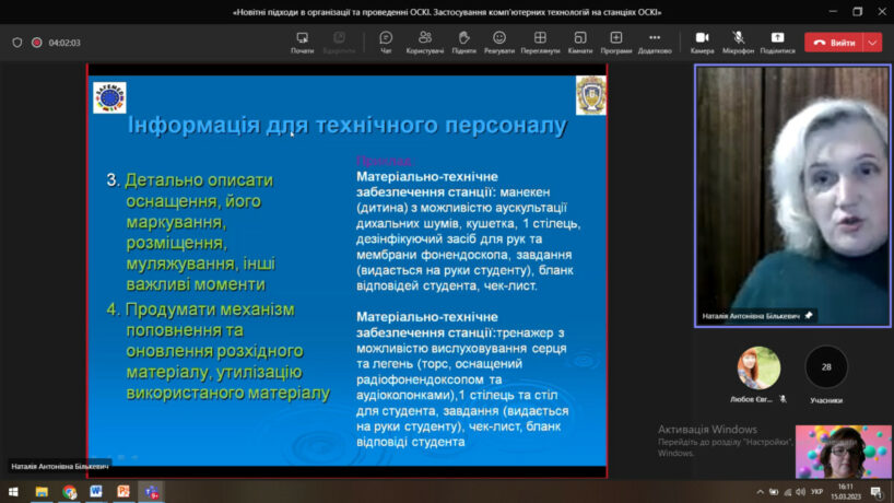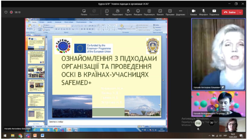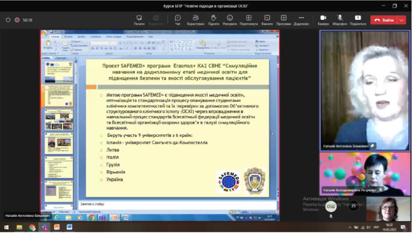 Наталія Бількевич розповіла про досвід проведення ОСКІ в країнах-учасницях проєкту SAFEMED+, зокрема в університеті Сантьяго де Компостела, Іспанія та двох медичних університетах в Єревані, Вірменія. Також вона в деталях зупинилася на етапах підготовки до ОСКІ, акцентувала на необхідності ретельної підготовки методичних матеріалів та клінічних сценаріїв. Учасники мали змогу задавати питання, щоб з’ясувати незрозумілі моменти.