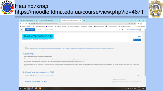 Наступна лекція Наталії Галіяш була присвячена представленню результатів проєкту SAFEMED+, зокрема представленню методики ОСКІ з віртуальною симуляцією клінічних кейсів. Доцільність впровадження такого формату ОСКІ обґрунтована можливістю забезпечити організацію більшої кількості станцій з економією ресурсів, а також він є зручним для ефективної перевірки такої складової клінічної компетентості студента як клінічне мислення, вміння призначити лабораторно-інструментальне обстеження та інтерпретувати отримані результати, визначити тактику ведення пацієнта. При правильній розробці клінічного сценарію, можна також перевіряти певні аспекти комунікативної компетентності студента чи перевіряти його знання алгоритмів фізикального обстеження. Учасники курсів мали змогу спробувати себе в ролі студентів і пройти одну віртуальну станцію, вже створену в Moodle. Також вони отримали завдання розробити один клінічний кейс для віртуальної симуляції.