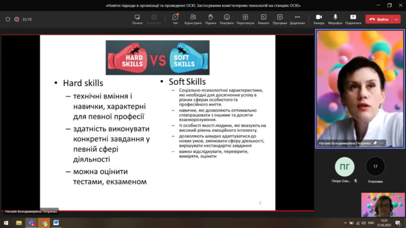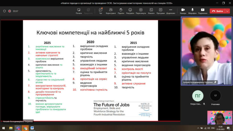 Наступне заняття було присвячене обговоренню важливості формування, так званих, софт-скіллз у студентів. Наталія Петренко розповіла, що на сьогодні вчені та футурологи, аналізуючи можливі шляхи розвитку майбутнього, переглянули ключові компетенції, які будуть необхідні випускникам для ефективного працевлаштування. Ми – викладачі – маємо розуміти, до чого готувати наших студентів.