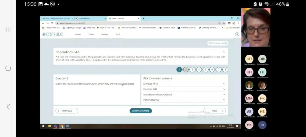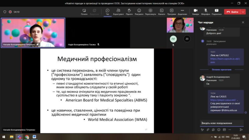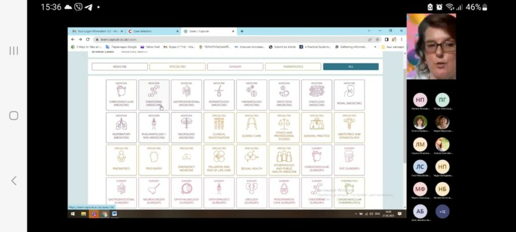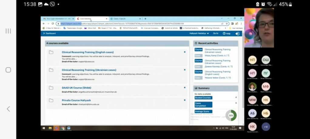 Наталія Галіяш ознайомила викладачів з можливостями використання платформ CAPSULE (Посилання https://learn.capsule.ac.uk/cases) та CASUS (https://player.casus.net/). Платформа CASUS надана для використання колегами з Мюнхенського медичного університету. На даний час там доступні біля 80 кейсів з віртуальними пацієнтами українською та англійською мовами. Перевагою цієї платформи є й те, що він надає можливість структурованого аналізу кейсів для формування клінічного мислення. Реєструватися потрібно зі своєї університетської скриньки @tdmu.edu.ua. Платформа доступна для викладачів та студентів.