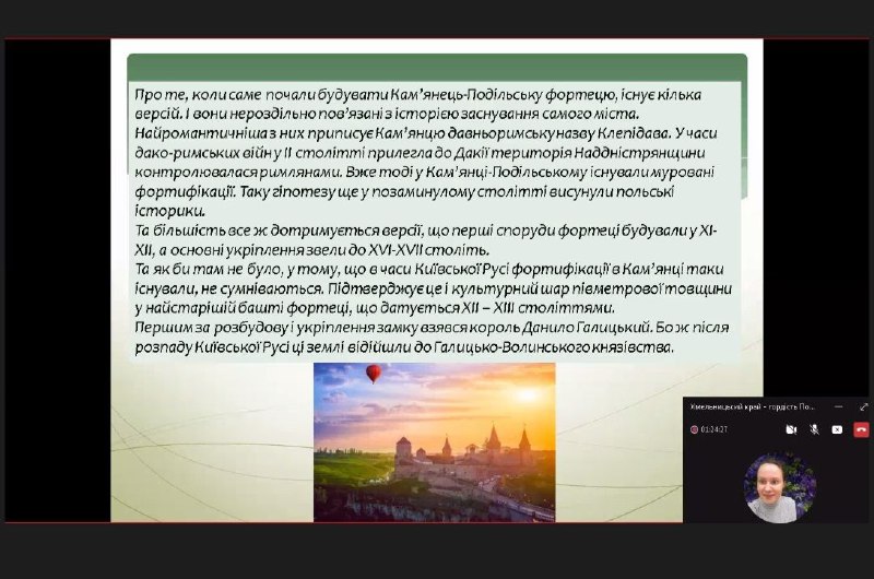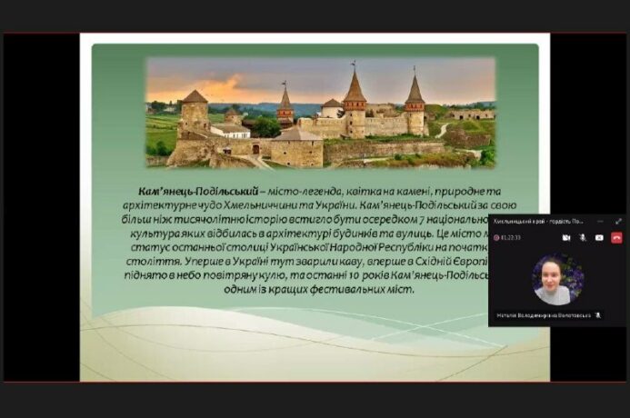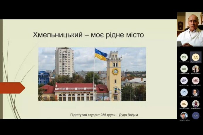 Вадим Дуда, студент ММ-286 (куратор доц. Шмата Р.М.) представив першу доповідь «Моє рідне місто – Хмельницький». Доповідач представив мальовничі місця свого рідного краю, такі як Меджибізький замок, печера Атлантида і водосховище Бакота.