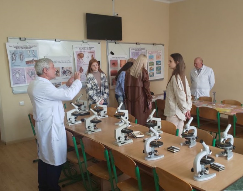 Старший викладач Стравський Я. С. та доцент Подобівський С. С. ознайомлюють учнів із медико-біологічними аспектами паразитизму.