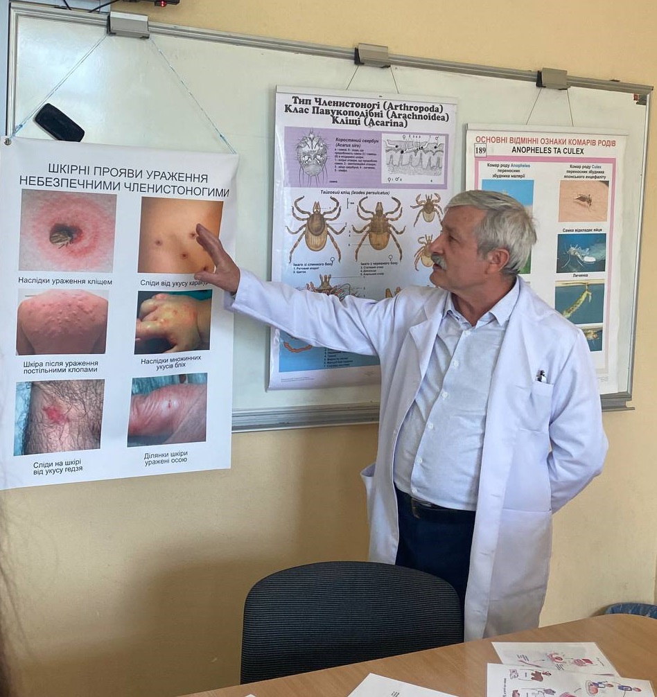 Доцент Подобівський С. С. розповів про роль комах і кліщів як переносників збудників хвороб людини та наголосив, що шкода, нанесена цими хворобами людству величезна, оскільки пандемії чуми та висипного тифу спустошували цілі країни. Учні мали можливість розглянути фотографії паразитів людини та ознайомитися зі специфікою будови їх життєвих форм на різних стадіях розвитку.