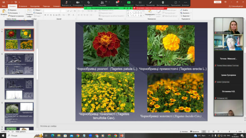 У харчовій промисловості та у харчуванні використовують багато видів роду Чорнобривці, завдяки наявності пігментів, глікозидів, органічних кислот, ефірних олій та вітамінів. Висушені квіти застосовують як спеції при солінні і маринуванні овочів, квітками декорують салати, сирні запіканки, бутерброди, холодні закуски і т. д. Професор Світлана Марчишин повідомила учасників семінару про те, що ТНМУ уклав угоду і співпрацює з кафедрою харчової біотехнології і хімії Тернопільського національного технічного університету імені Івана Пулюя, впроваджуючи дослідження з чорнобривців у практику. Колеги з ТНТУ випікають хлібобулочні вироби з додаванням до них екстрактів з квіток чорнобривців розлогих.