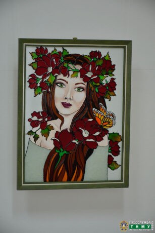 Вишукану аристократичність золотаво-чорних барв панно Петра Левицького вигідно й органічно доповнює кольорова розмаїтість робіт Юлії Сватко, виконаних із застосуванням техніки розпису по склі вітражними фарбами.