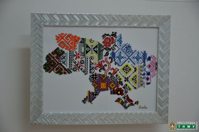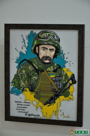 Але центральними в експозиції, щемкими і сповненими глибокого змісту, на нашу думку, що суголосна авторській, є портрет Тараса Шевченка у бронежилеті, касці та зі зброєю в руках і карта України, єдиної і неподільної держави, виконана у стилі колажу, де арт-об’єктами слугують елементи народної вишивки різних регіонів країни.