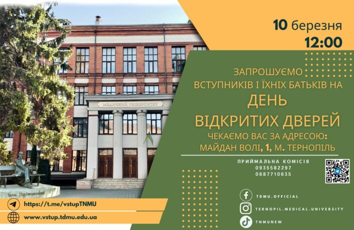 День відкритих дверей у Тернопільському національному медичному університеті відбудеться 10 березня 2024 року о 12:00 в адміністративному корпусі ТНМУ за адресою: Майдан Волі, 1, м. Тернопіль.