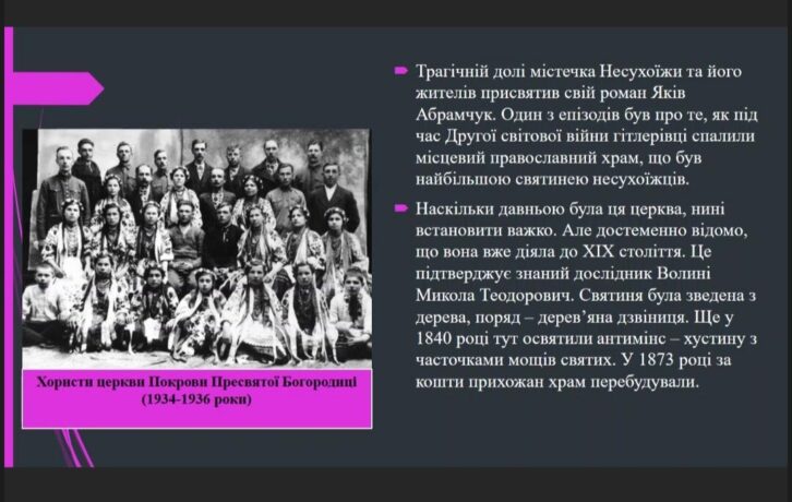 Трагічній долі містечка Несухоїжи та його жителів присвятив свій роман Яків Абрамчук. Один з епізодів був про те, як під час Другої світової війни гітлерівці спалили місцевий православний храм, що був найбільшою святинею несухоїжців. Наскільки давньою була ця церква, нині встановити важко. Але достеменно відомо, що вона вже діяла до ХІХ століття. Це підтверджує знаний дослідник Волині Микола Теодорович. Святиня була зведена з дерева, поряд – дерев’яна дзвіниця. Ще у 1840 році тут освятили антимінс – хустину з часточками мощів святих. У 1873 році за кошти прихожан храм перебудували.