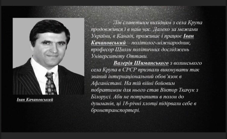 Лік славетним вихідцям з села Крупа продовжився і в наш час. Далеко за межами України, в Канаді, проживає і працює Іван Качановський – політолог-міжнародник, професор Школи політичних досліджень Університету Оттави. Валерія Шиманського з волинського села Крупа в СРСР призвали виконувати так званий інтернаціональний обов’язок в Афганістані. На тій війні бойовим побратимом для нього став Віктор Ткачук з Білорусі. Аби не потрапити в полон до душманів, ці 18-річні хлопці підірвали себе в бронетранспортері.. А в сусідніх Підгайцях ось уже майже двадцять років проводять традиційний турнір з волейболу, присвячений пам’яті воїнів-інтернаціоналістів Валерія Шиманського та Віктора Ткачука.