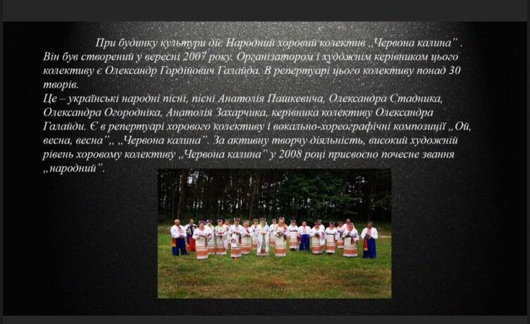 При будинку культури діє Народний хоровий колектив „Червона калина” . Він був створений у вересні 2007 року. Організатором і художнім керівником цього колективу є Олександр Гордійович Галайда.