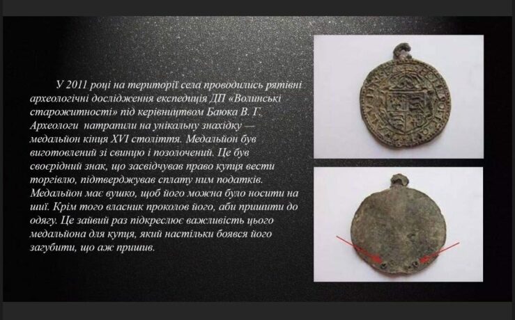 У 2011 році на території села проводились археологічні дослідження. Так, археологи експедиції із ДП «Волинські старожитності» під керівництвом Баюка В. Г. натрапили на унікальну знахідку — медальйон кінця XVI століття. Медальйон був виготовлений зі свинцю і позолочений. Це був своєрідний знак, що засвідчував право купця вести торгівлю, підтверджував сплату ним податків.