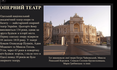 У Одесі є дуже красивий оперний театр. Одеський національний академічний театр опери та балету — є настарішим закладом такого типу в Україні. Цьогоріч йому виповниться 134 роки, однак це друга будівля в історії міста.