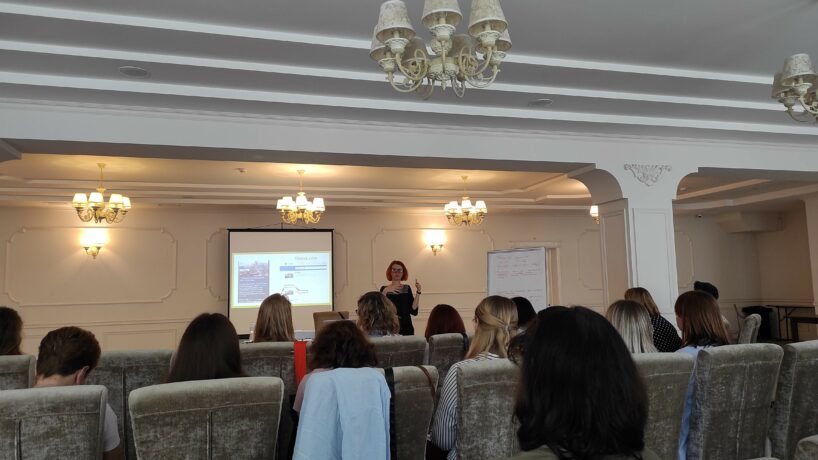 Головна спікерка тренінгу, співзасновниця інтернет-проєкту “StopFake” Ольга Юркова розповідала учасницям тренінгу про те, що таке фейк, чим він відрізняється від маніпуляції чи дезінформації, як їх розпізнавати і боротися з ними.