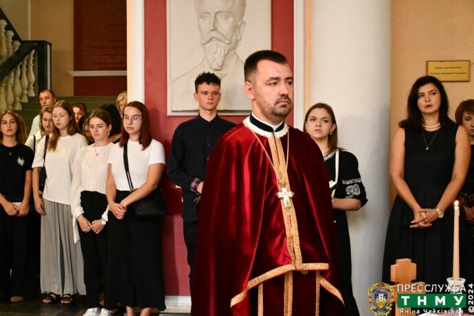В адміністративному корпусі Тернопільського національного медичного університету викладачі і студенти 29 серпня 2024 року зібралися вшанувати пам’ять полеглих у боях за незалежність України студентів і випускників вишу. Капелан ТНМУ – отець Ігор Драпак відправив заупокійне богослужіння з молитвою про те, щоб всі наші загиблі захисники отримали милість Божу і їхні душі знайшли спокій.