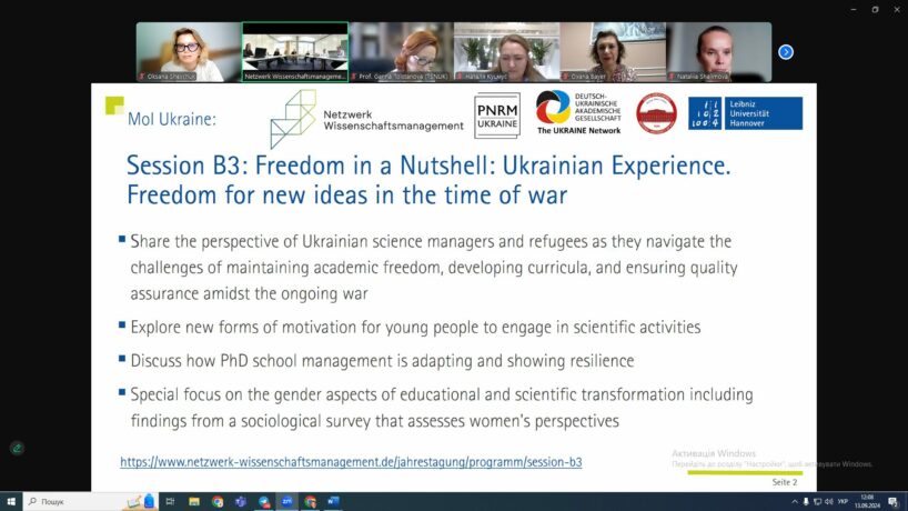 13 вересня 2024 року відбулася онлайн-подія «Про свободу коротко: український досвід. Свобода для нових ідей під час війни» (Freedom in a Nutshell: Ukrainian Experience. Freedom for new ideas in the time of war), яку організували Netzwerk Wissenschaftsmanagement (Мережа менеджерів освіти та науки Німеччини, https://netzwerk-wissenschaftsmanagement.de/) у співпраці з Професійною мережею менеджерів освіти і науки України (PNRM Ukraine – https://pnrm.org/) за підтримки проєкту DAAD – Інтернаціоналізація вищої освіти в Україні. MoI Ukraine: Management of Internationalisation and German-Ukrainian Academic Cooperation (https://www.uni-hannover.de/en/universitaet/internationales/moi-ukraine).