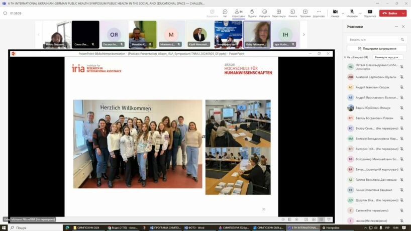 25-26 вересня 2024 року Тернопільським національним медичним університетом імені І.Горбачевського спільно з Акконським Гуманітарним Університетом Берліну та Центром громадського здоров’я МОЗ України проведено шостий науковий симпозіум з міжнародною участю «Громадське здоров’я в соціальному і освітньому просторі – виклики в умовах надзвичайних ситуацій та перспективи розвитку» на базі Тернопільського національного медичного університету імені І.Горбачевського.