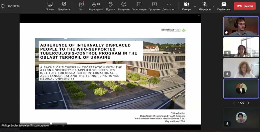 Доповідь Філіпа Ендлера (Philipp Endler) – студента міжнародних наук про здоров’я, університету Фульди та асистента-студента Інститут досліджень міжнародної допомоги (IRIA) Акконського університету гуманітарних наук «Приєднання внутрішньо переміщених осіб до програми боротьби з туберкульозом за підтримки ВООЗ у Тернопільській області України» (Adherence of Internally Displaced People to the WHO-supported tuberculosis-control program in the Oblast Ternopil of Ukraine, Берлін) присвячена питанням боротьби з туберкульозом в умовах війни в Україні. Провідною думкою, яка потребує подальшого дослідження,, є вивчення вибору пацієнтів між лікуванням і безпекою.