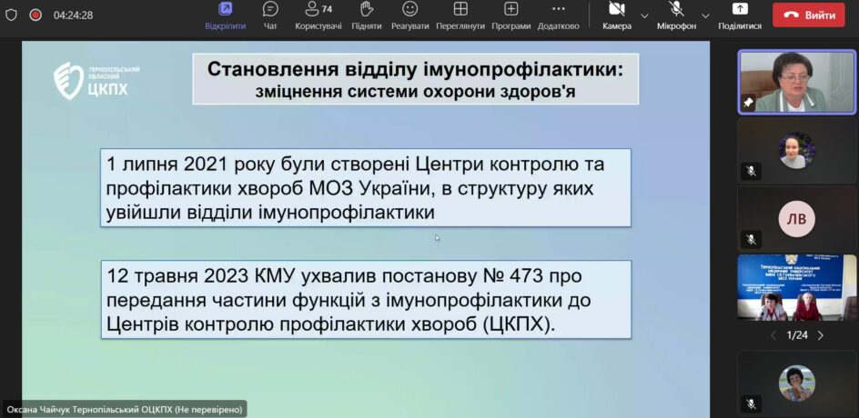 Як завжди, актуальною була доповідь Оксани Чайчук, генеральної директорки ДУ «Тернопільський обласний центр контролю та профілактики хвороб МОЗ України», головної державної санітарної лікарки області, у якій вона висвітлила питання «Про стан імунопрофілактики в Тернопільській області за 2023-2024 роки». У виступі підняті актуальні проблеми з розділу імунопрофілактики та шляхи їх подолання.