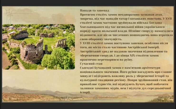 Бучач – місто на заході України, в Тернопільській області, з багатою та унікальною історією, що робить його цікавим як з історичної, так і з культурної точки зору. Його назва вперше згадується в літописах у XIV столітті. У різні часи Бучач належав Польщі, Литві, входив до складуАвстрійської імперії, а згодом — до Австро-Угорщини. Така багата історія відобразилася на культурному і архітектурному вигляді міста.