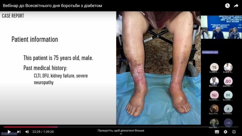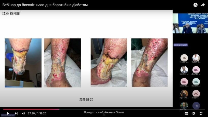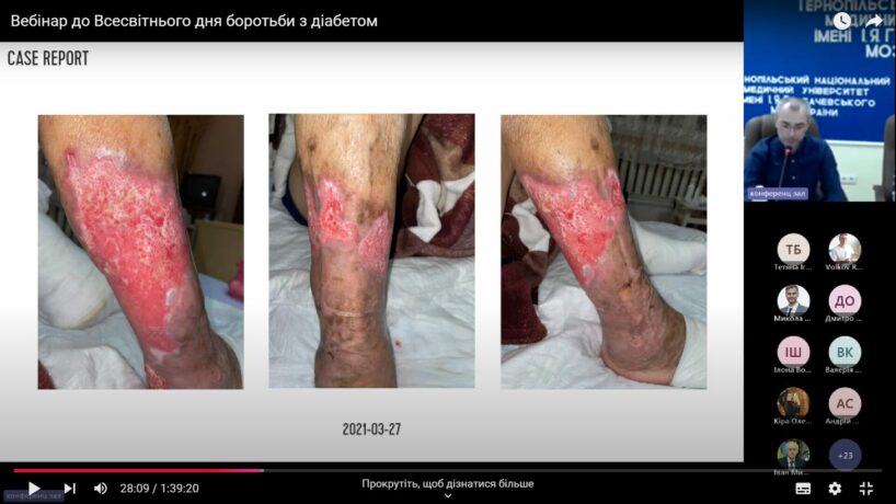 У рамках вебінару свої доповіді представили фахівці у галузі ендокринології та хірургії. Зокрема Сергій Карпенюк лікар-хірург та керівник Західного центру лікування ран поділився особистим досвідом лікування нейропатичних та змішаних виразок стопи у пацієнтів із діабетом, а саме застосування концепції TIME.