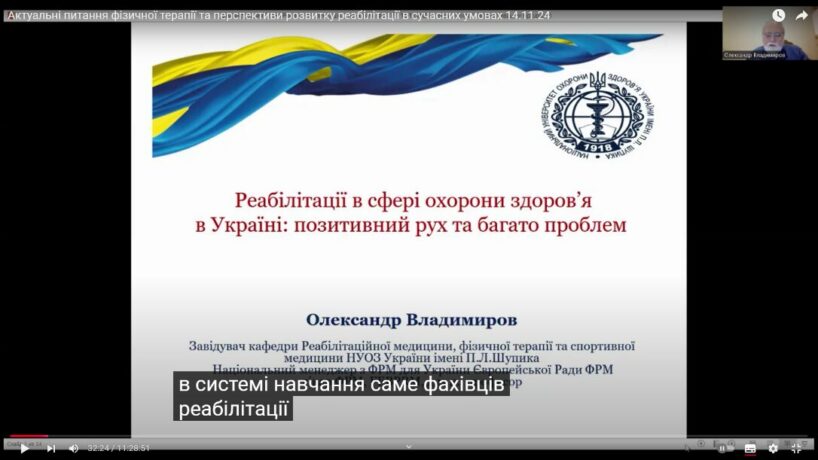Доповідь на тему «Реабілітація в сфері охорони здоров’я в Україні: позитивний рух з багатьма проблемами» представив завідувач кафедри реабілітаційної медицини, фізичної терапії та спортивної медицини Національного університету охорони здоров’я України імені П.Шупика, професор Олександр Владимиров.