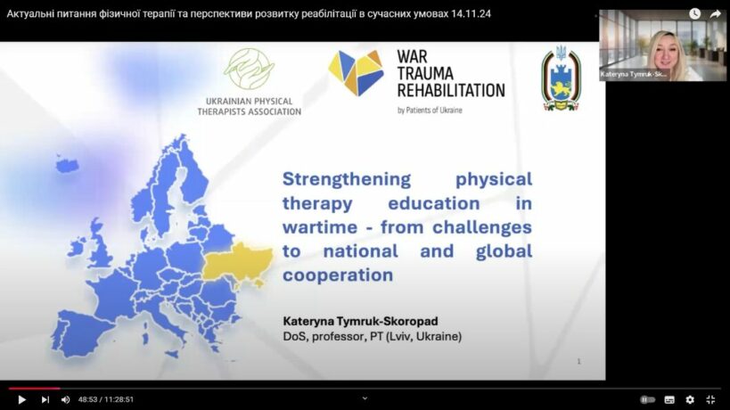 Катерина Тимрук-Скоропад, професор кафедри терапії та реабілітації Львівського державного університету фізичної культури представила доповідь на тему «Зміцнення освіти з фізичної терапії в Україні у партнерстві та національній й глобальній співпраці».