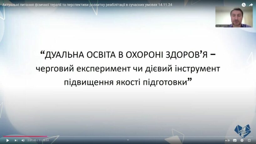 «Проблемні питання запровадження дуальної освіти у фізичній терапії в Україні» представив завідувач кафедри фізичної реабілітації, спортивної медицини та валеології, професор Олег Неханевич.