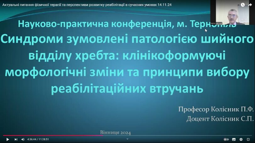 Продовжив пленарне засідання конференції професор Петро Колісник, який презентував доповідь на тему «Синдроми, зумовлені патологією шийного відділу хребта: клінікоформуючі морфологічні зміни та принципи вибору реабілітаційних втручань». Він закцентував увагу на важливості проведення реабілітаційних заходів при даній патології шийного відділу хребта.