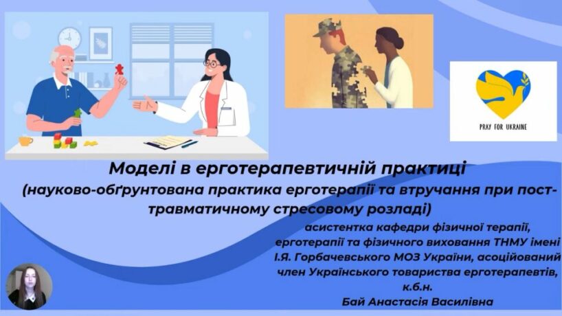 Про «Моделі в ерготерапевтичній практиці (науково-обґрунтована практика ерготерапії та втручання при пост-травматичному стресовому розладі)» розповіла асистент кафедри фізичної терапії, ерготерапії та фізичного виховання ТНМУ Анастасія Бай.